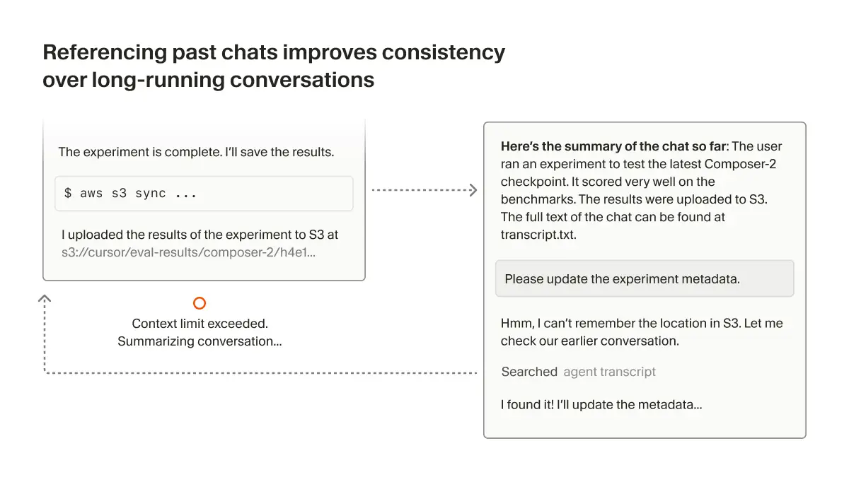 - 在摘要过程中引用对话历史。Cursor将历史对话将其保存为文件,在后续要使用的时候,可以通过文件引用找回来。