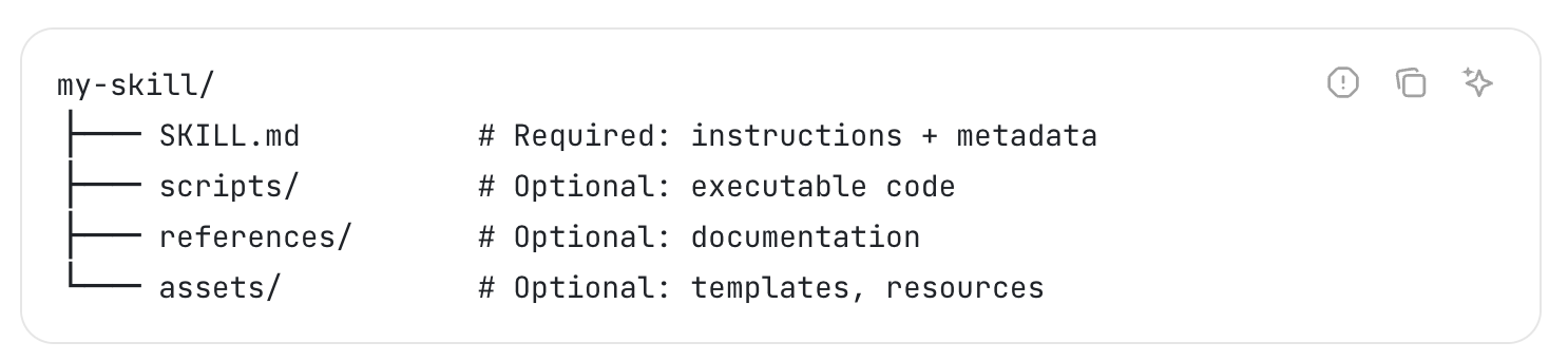 这个网站里面讲述了怎么配置agent的skills,里面包包括一个最重要的SKILL.md,还有其他的文件夹,里面可以添加脚本,资源文件等