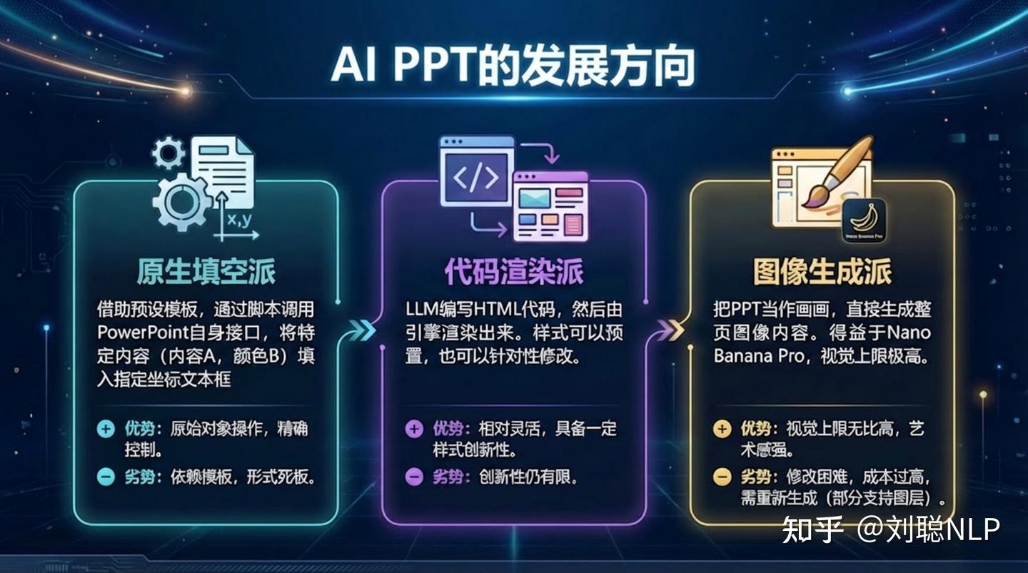 - 图像生成派:把PPT当作画画,把每页内容直接画出来,因为Nano Banana Pro的出现,上限无比高,但不易修改,成本也过高,每次修改都是重新生成图片,当然也有可以图层操作。
