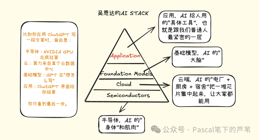 大多数机会其实在 Applications,90% 的商业价值在最上面,90% 的钱在下面两层被烧掉。我说的再现实一点就是: